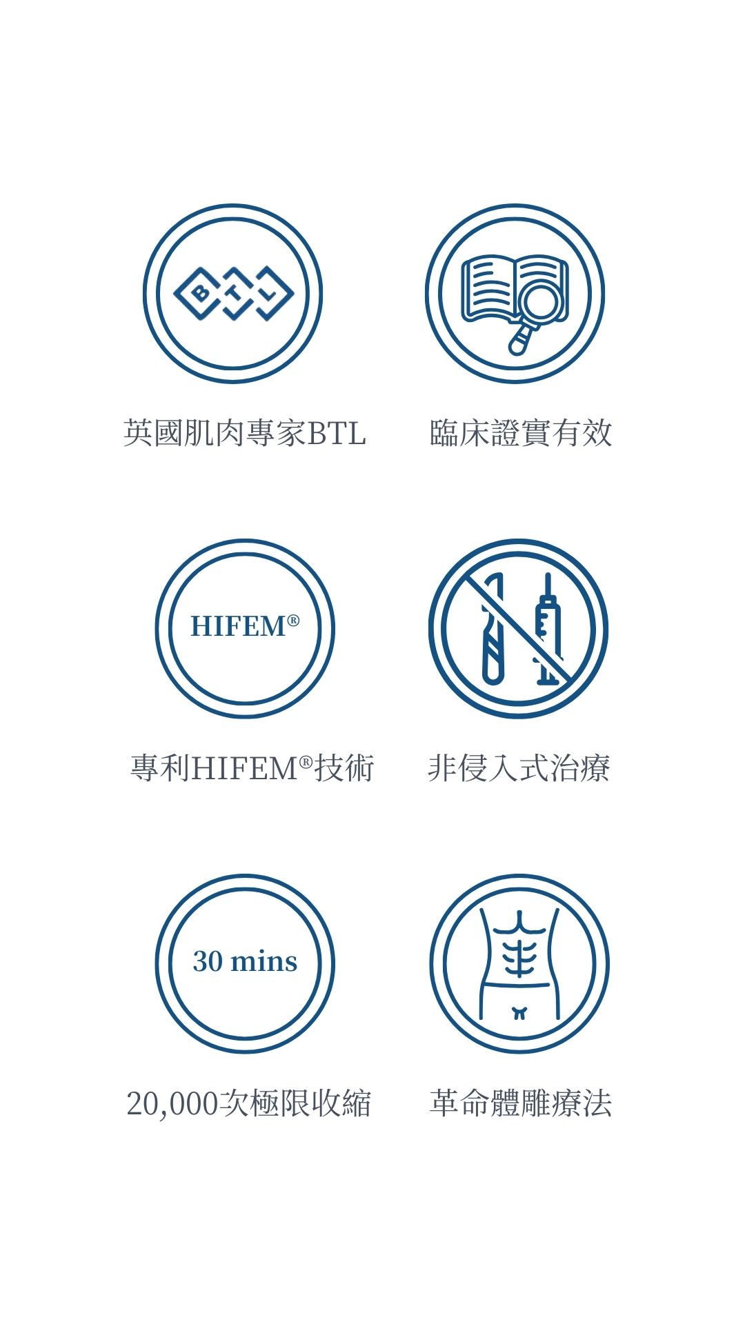 EMBODY 核心美力由英國 BTL 研發製作,是非侵入式的療程,並且使用專利 HIFEM(High-Intensity Focused Electromagnetic) 高強度聚焦磁能技術的核心體雕儀器,可以使肌肉完成在自主運動下無法達到的「超極限收縮」,讓肌肉產生高強度的擴張及收縮,深度最深可達7公分,激活深層的肌群進行運動,針對現代人最在意的「腹部」核心訓練。